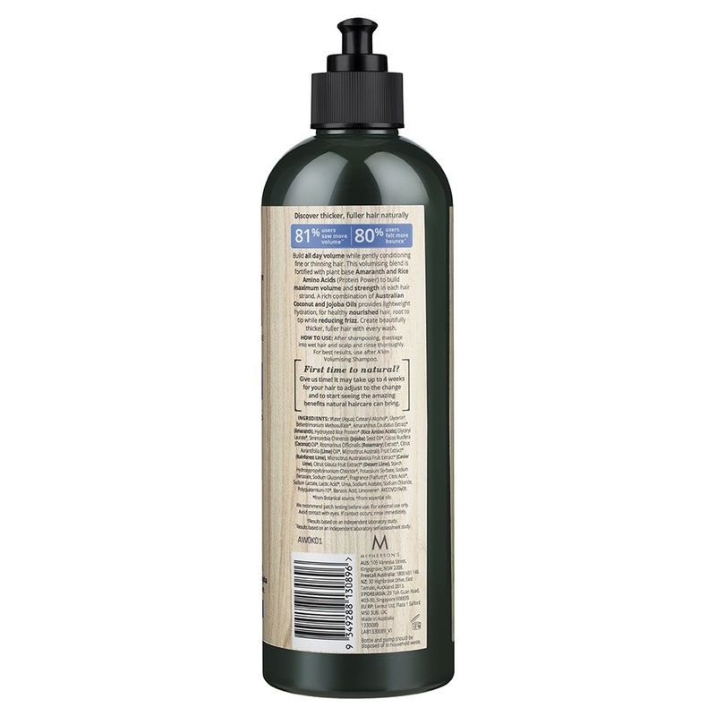 Build all-day volume while gently conditioning fine or thinning hair. This volumising blend is fortified with plant base Amaranth and Rice Amino Acids (Protein Power) to build maximum volume and strength in each hair strand. A rich combination of Australian Coconut and Jojoba Oils provides lightweight hydration, for healthy nourished hair, root to tip while reducing frizz. Create beautifully thicker, fuller hair with every wash. – Scientifically Proven to add 3x more volume after one wash – 81% users saw more volume – 80% users felt more bounce Hair Type: Fine and Thinning Hair All A’kin Shampoos and Conditioners are silicone free.